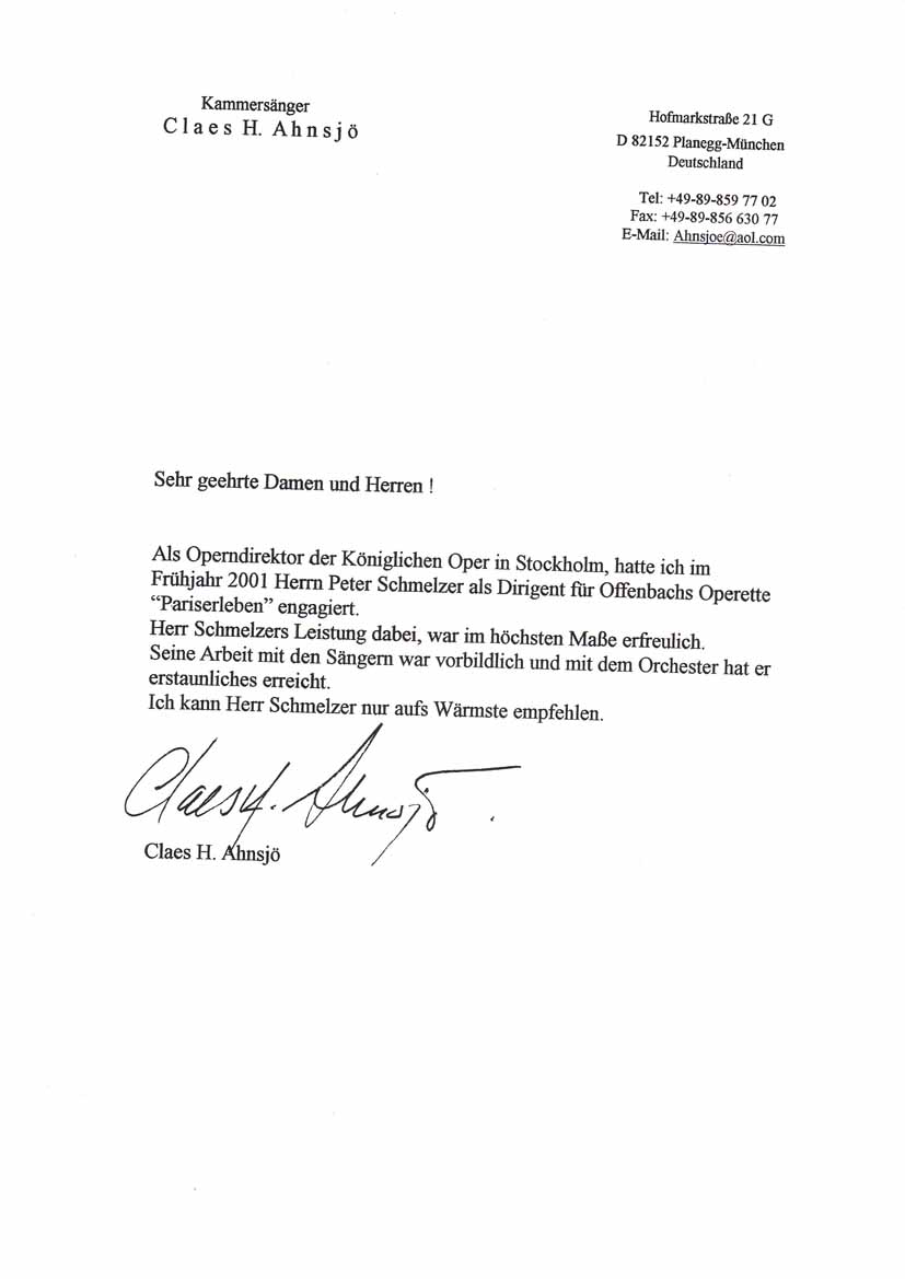 Empfehlungsschreiben Kammersänger Claes H. Ahnsjö