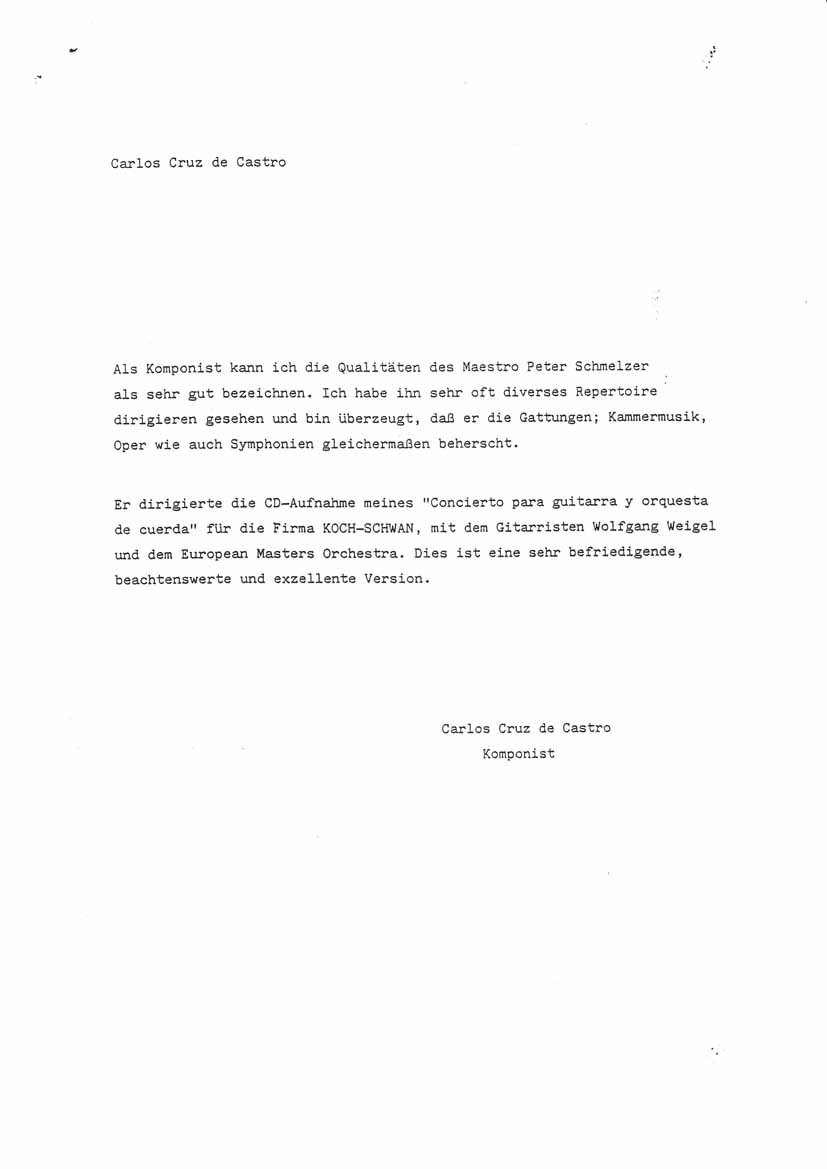 Empfehlungsschreiben Komponist Carlos Cruz de Castro (deutsche Übersetzung)