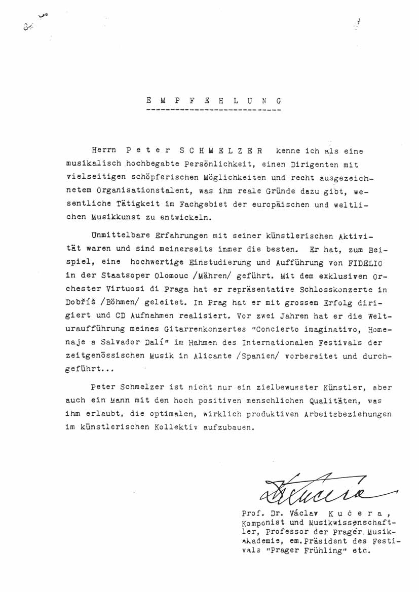 Empfehlungsschreiben Komponist und em. Präsident des Festivals "Prager Frühling" Prof. Dr. Václav Kučera